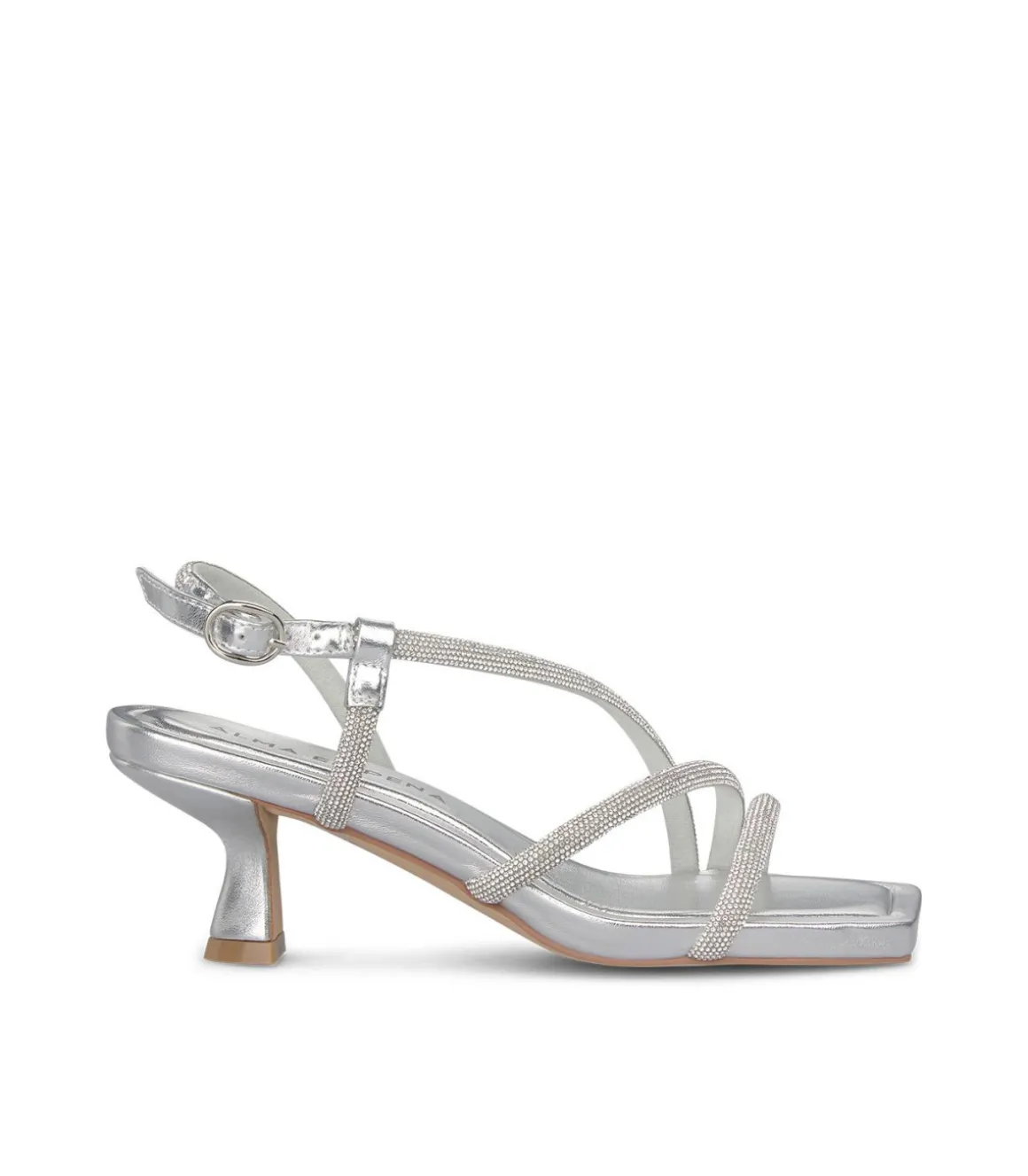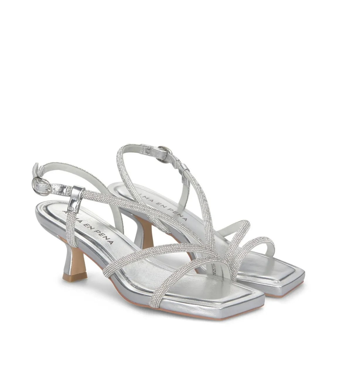 Sandalia de tacón chupete de mujer con tiras de pedrería. Cierre con hebilla y puntera cuadrada. La altura del tacón es de 6cm.