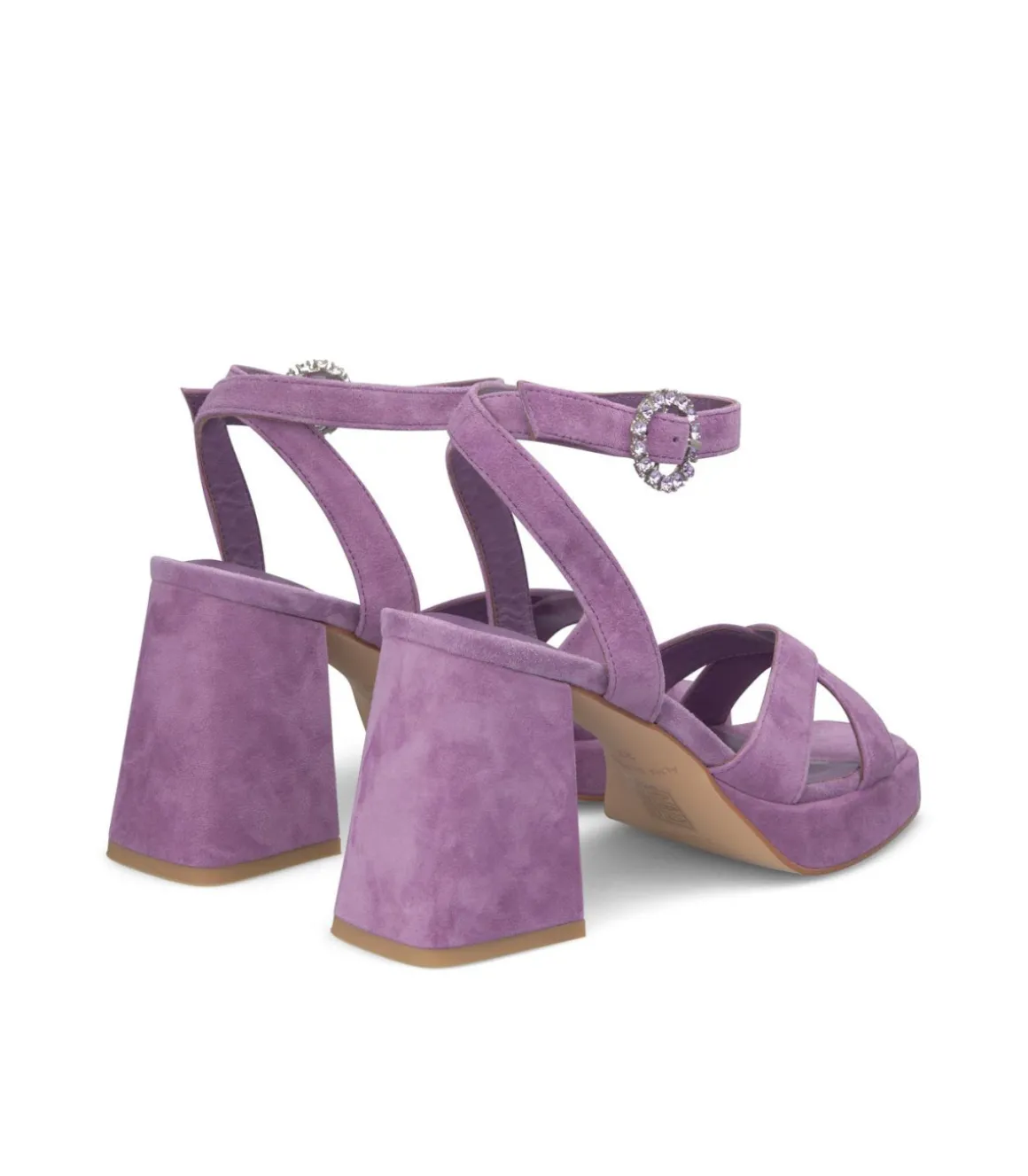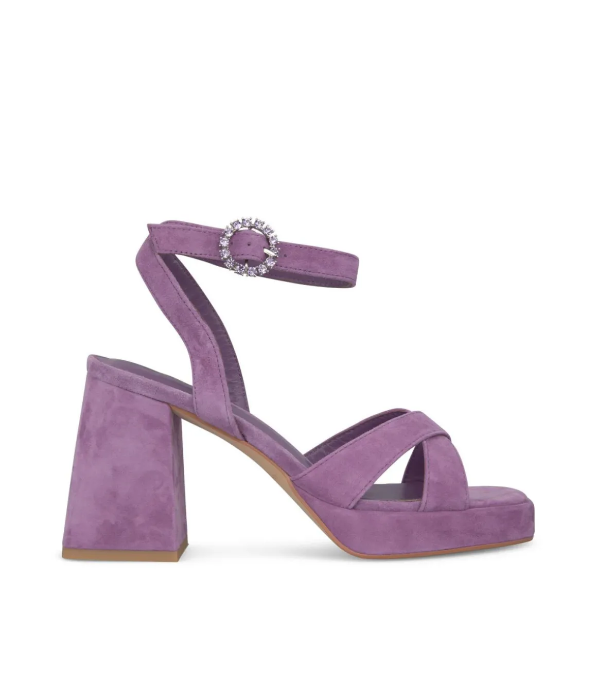 Sandalia de tacón de mujer con tiras cruzadas. Tacón bloque cuadrado y cierre con hebilla altura del tacón es de 9cm.