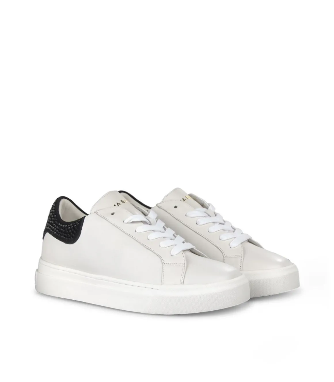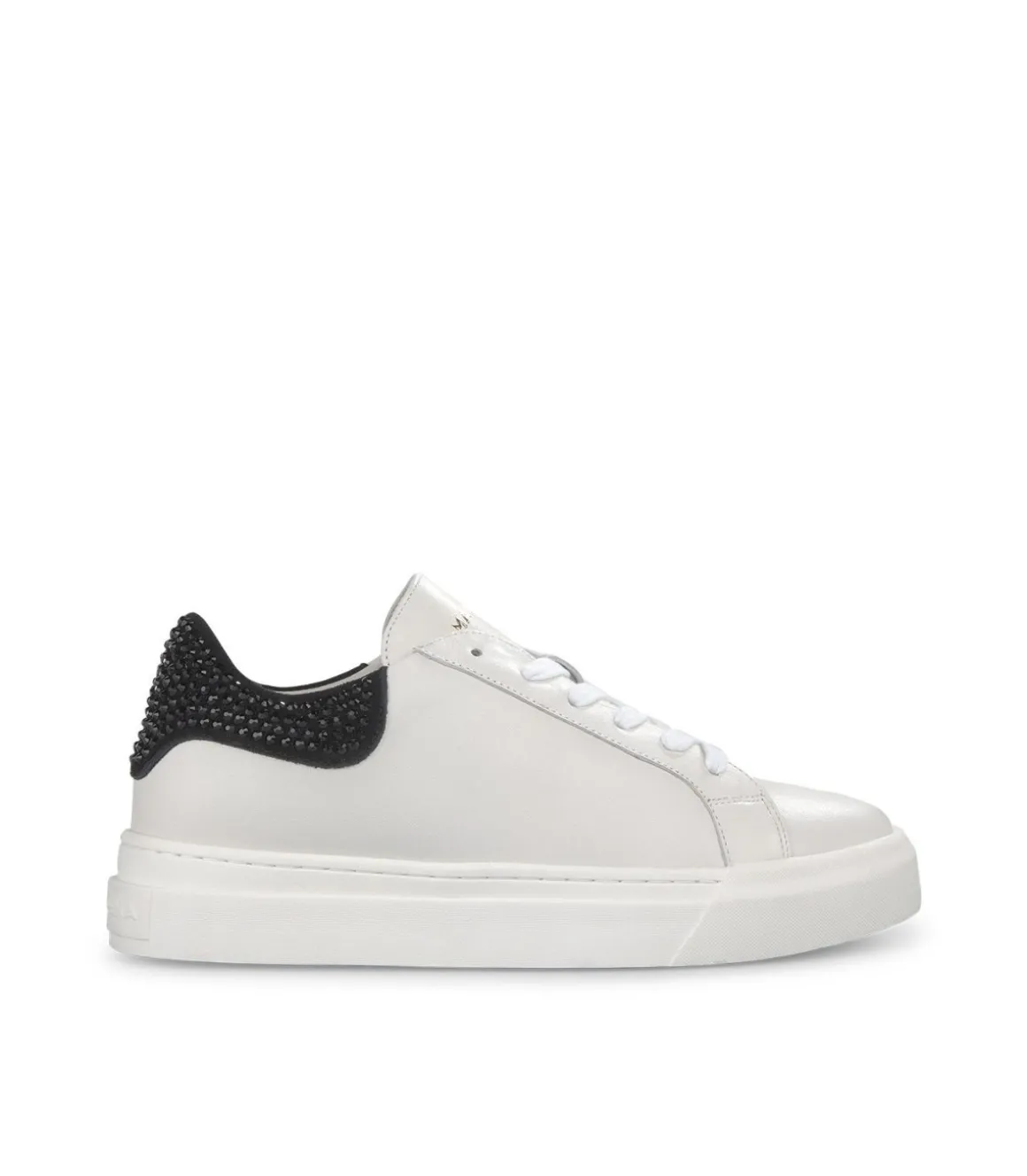 Sneaker de mujer realizada en piel con detalles de pedrería. Cierre con cordones y puntera redonda. Suela con plataforma de 3,8cm.