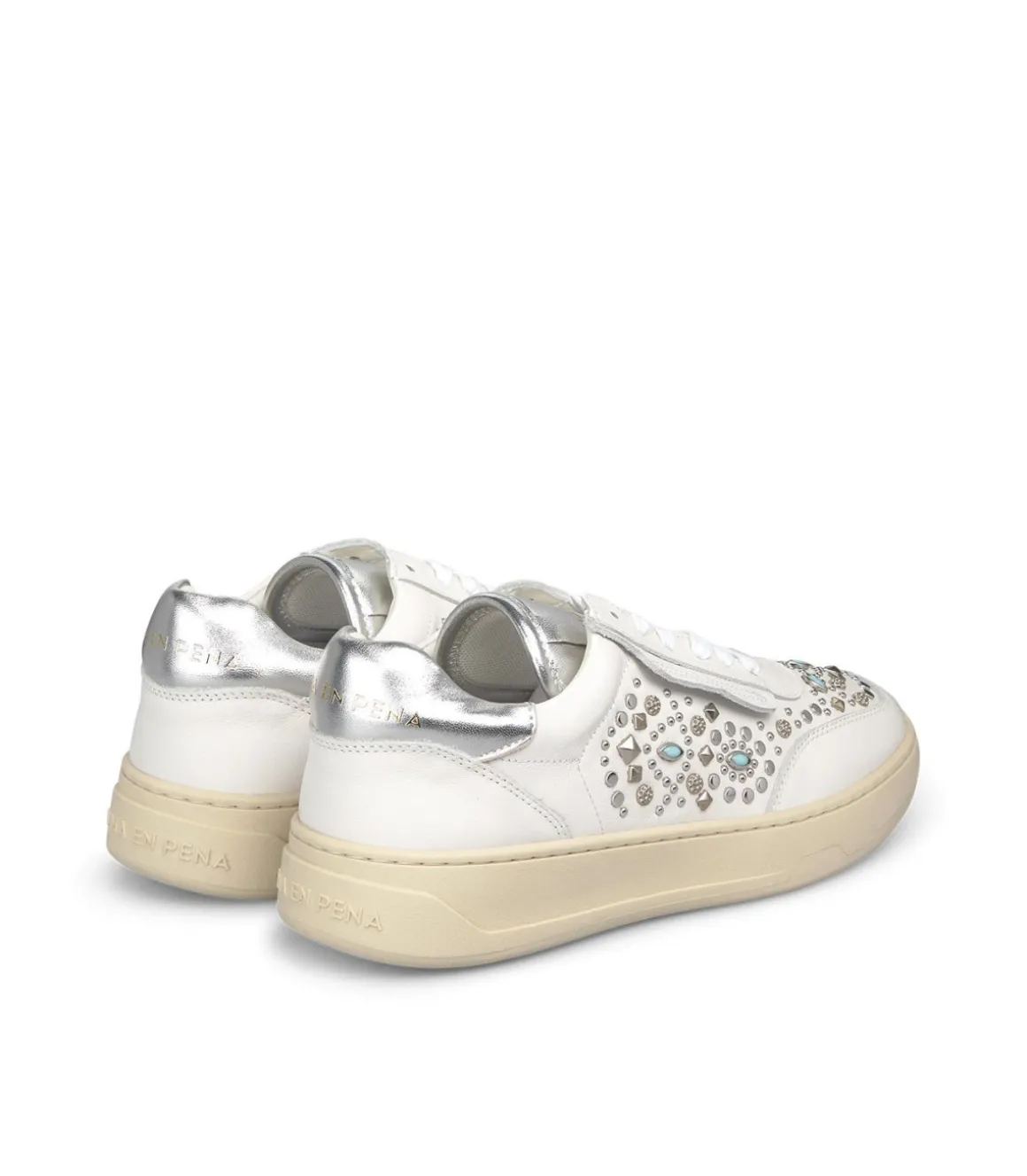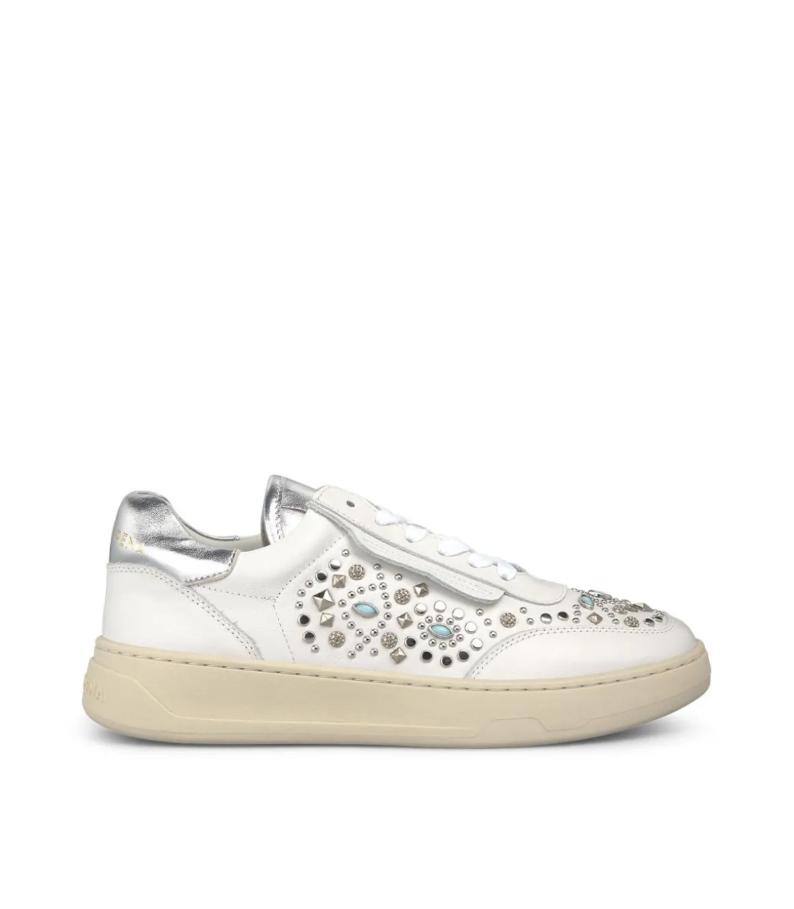 Sneaker mujer realizada en piel con detalles de tachas. Cierre con cordones. Suela con plataforma de 3cm.