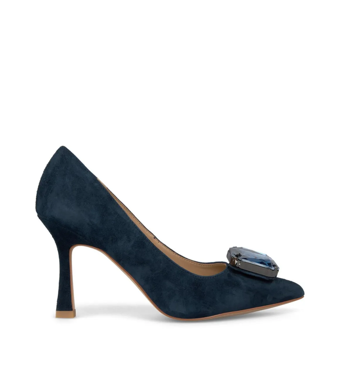 Zapato con tacón aguja de mujer. La puntera es afilada con detalle de pedrería cuadrado y confeccionado en piel. La altura del tacón es de 9,5cm.
