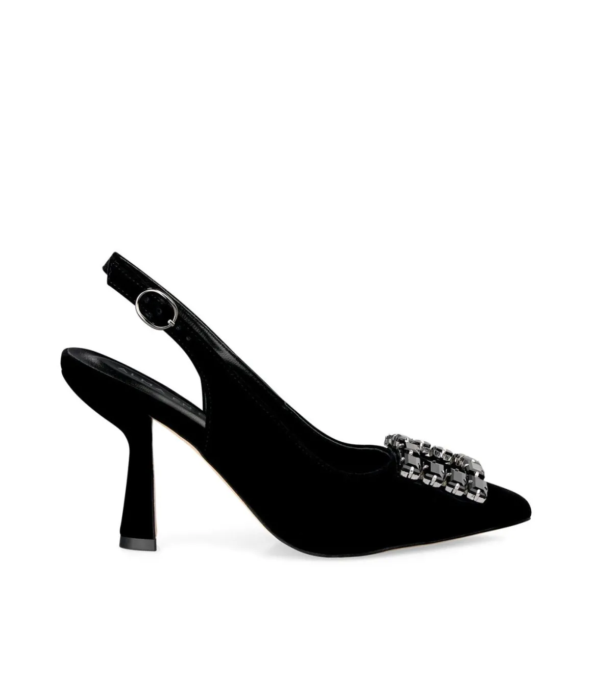 Zapato de tacón de mujer realizado en piel. Adorno cuadrado de pedrería en la puntera. La altura del tacón es de 9cm.