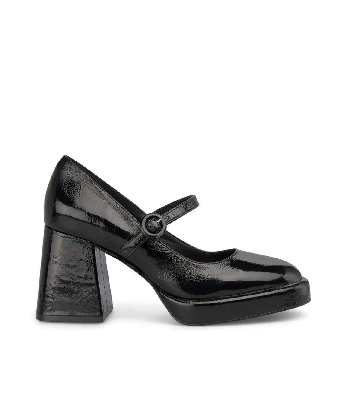 Zapato de tacón de mujer de charol. Con tira en el empeine que se cierra con hebilla. La puntera es cuadrada. La altura del tacón es de 9cm.