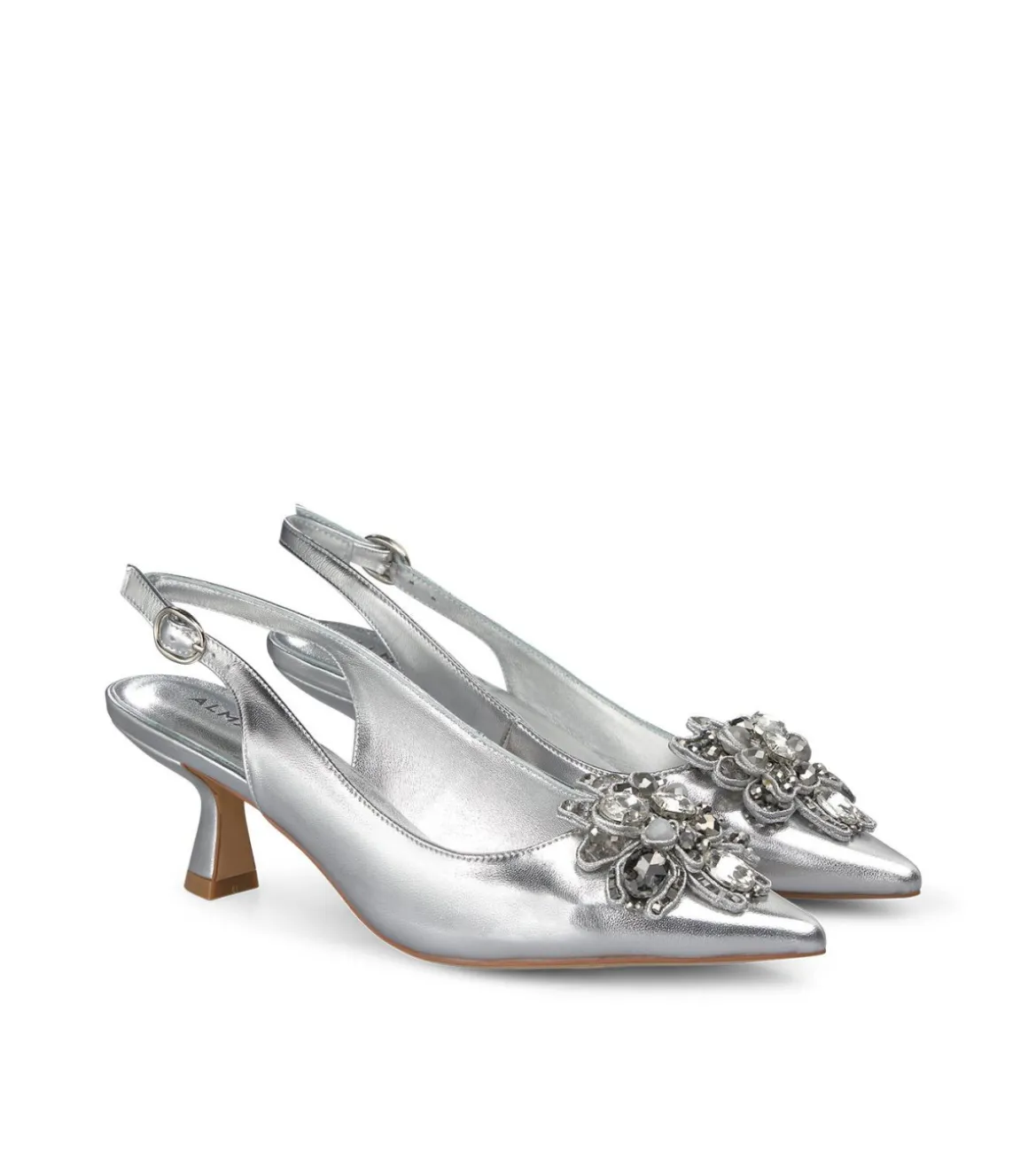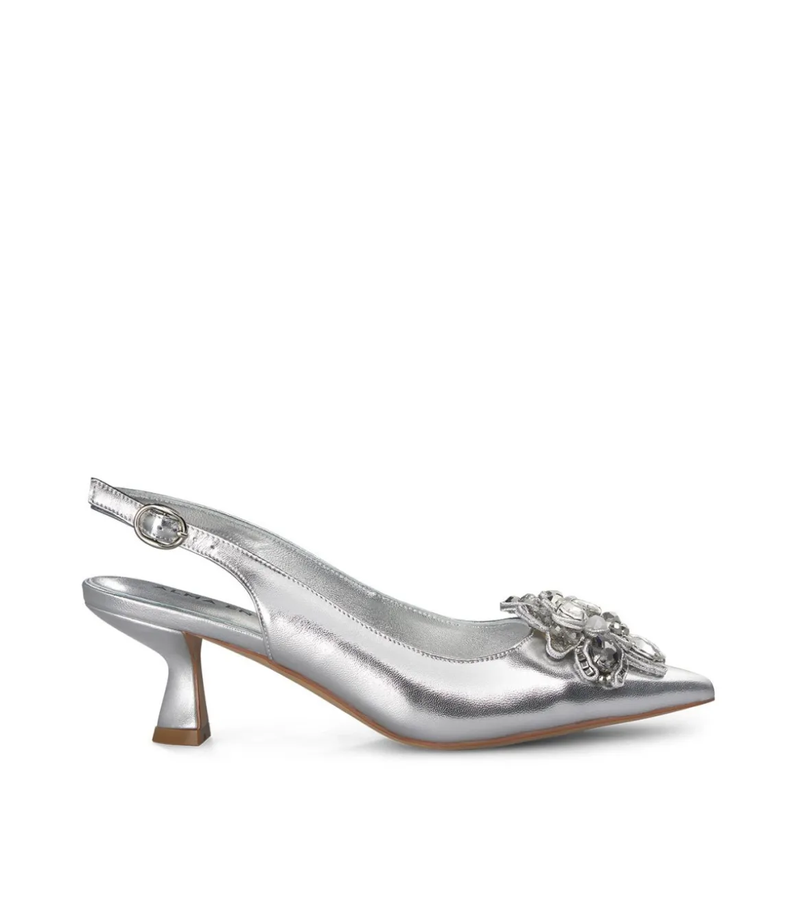 Zapato de tacón chupete con puntera afilada y adorno de flor. Sin cierre. La altura del tacón es de 6cm.