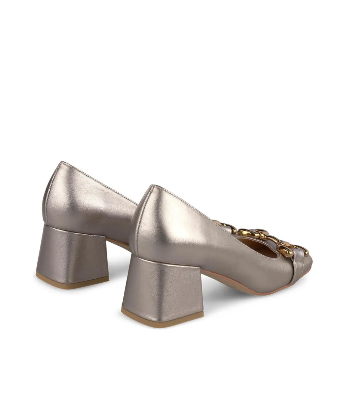 Zapato de tacón realizado en piel con adorno de estribo. Tacón bloque y puntera cuadrada. La altura del tacón es de 7,5cm.