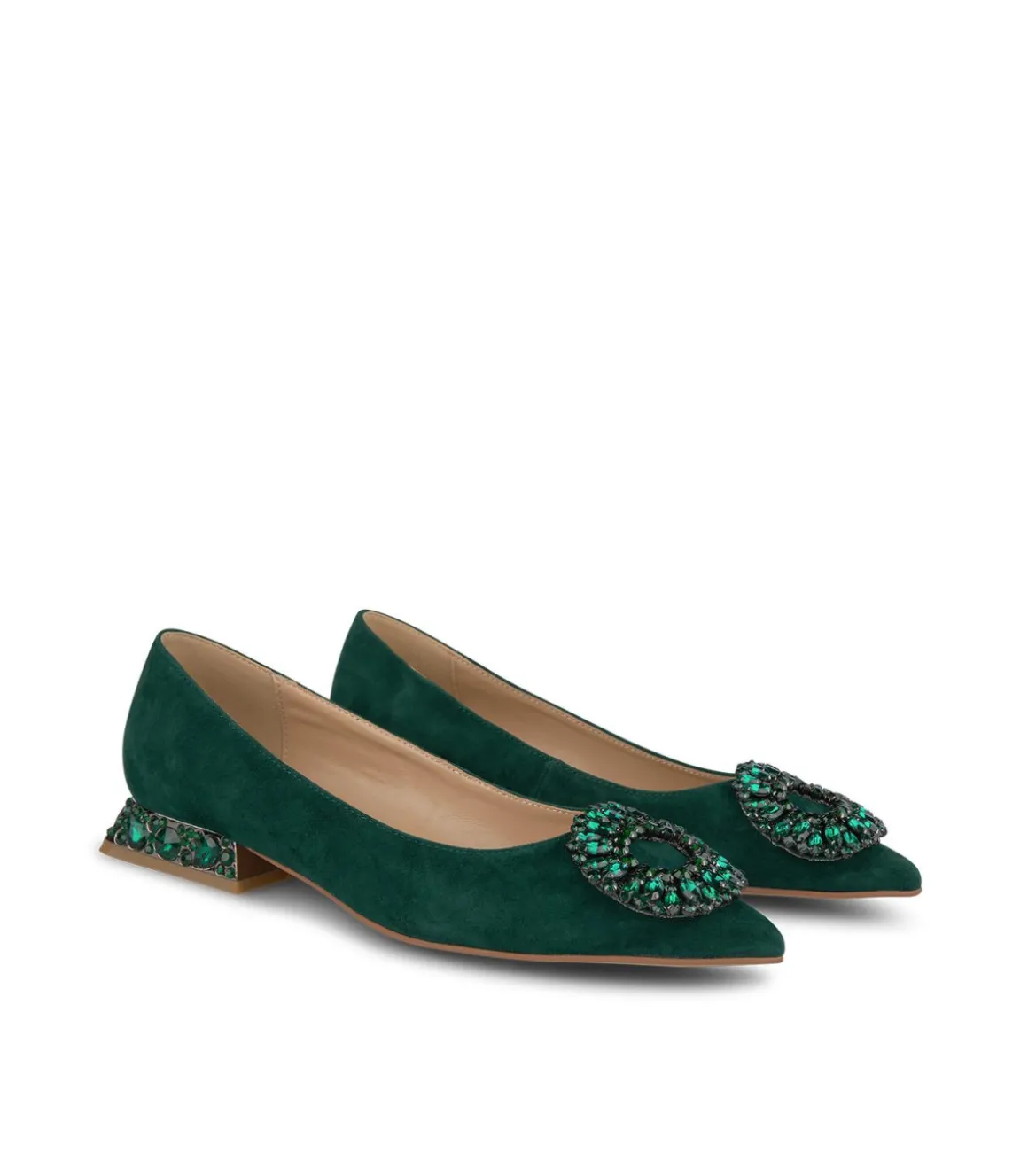 Bailarina realizada en piel con adorno circular en la punta. Tacón con pedrería. La altura del tacón es de 2,3cm.