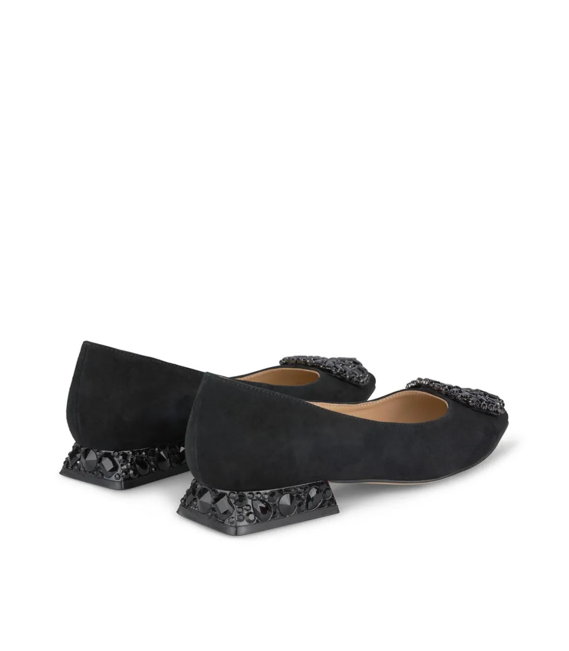 Bailarina realizada en piel con adorno circular en la punta. Tacón con pedrería. La altura del tacón es de 2,3cm.