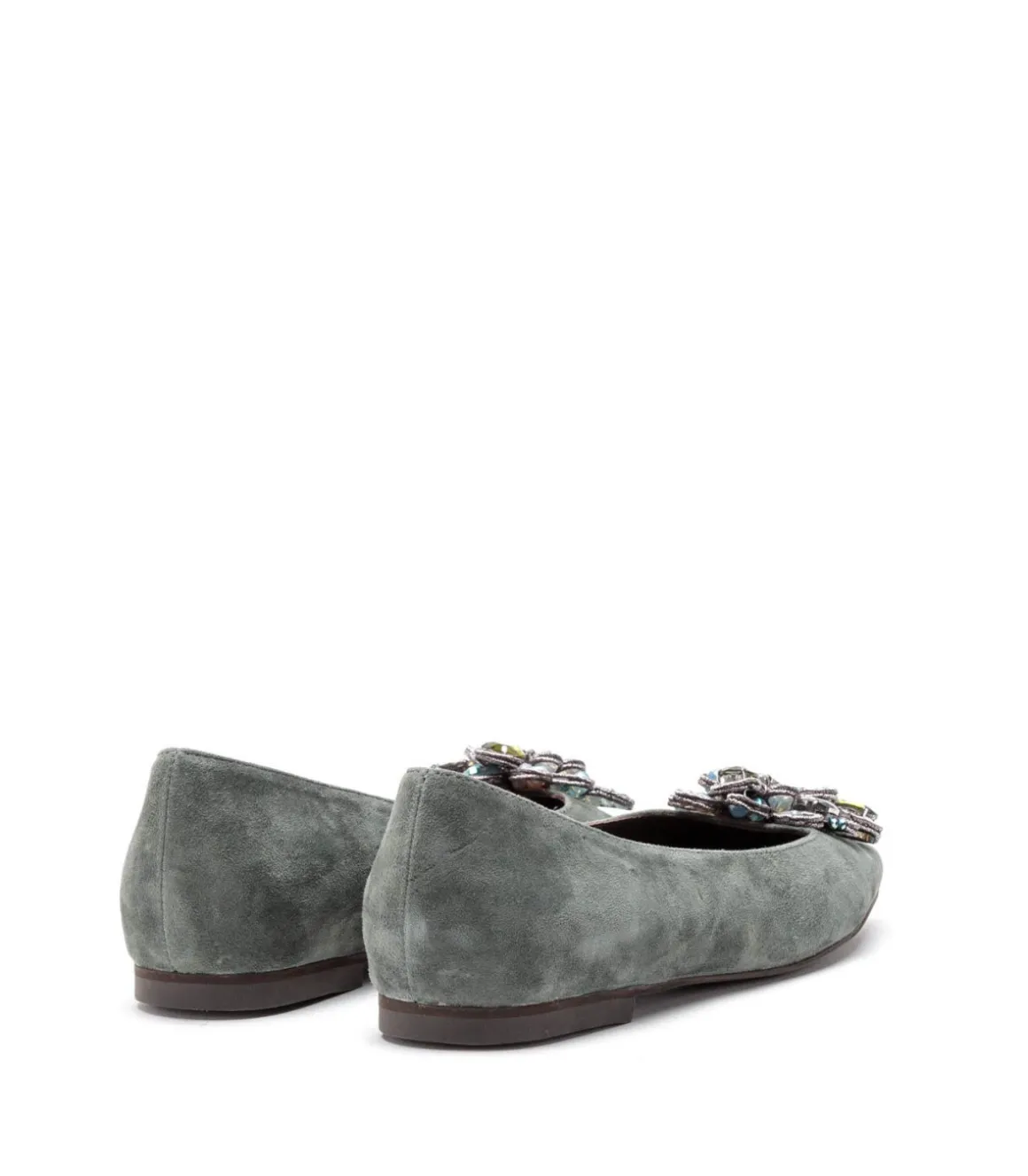 Bailarina de mujer realizada en piel con adorno de flor cubierta de pedrería. La altura del tacón es de 2,3cm.