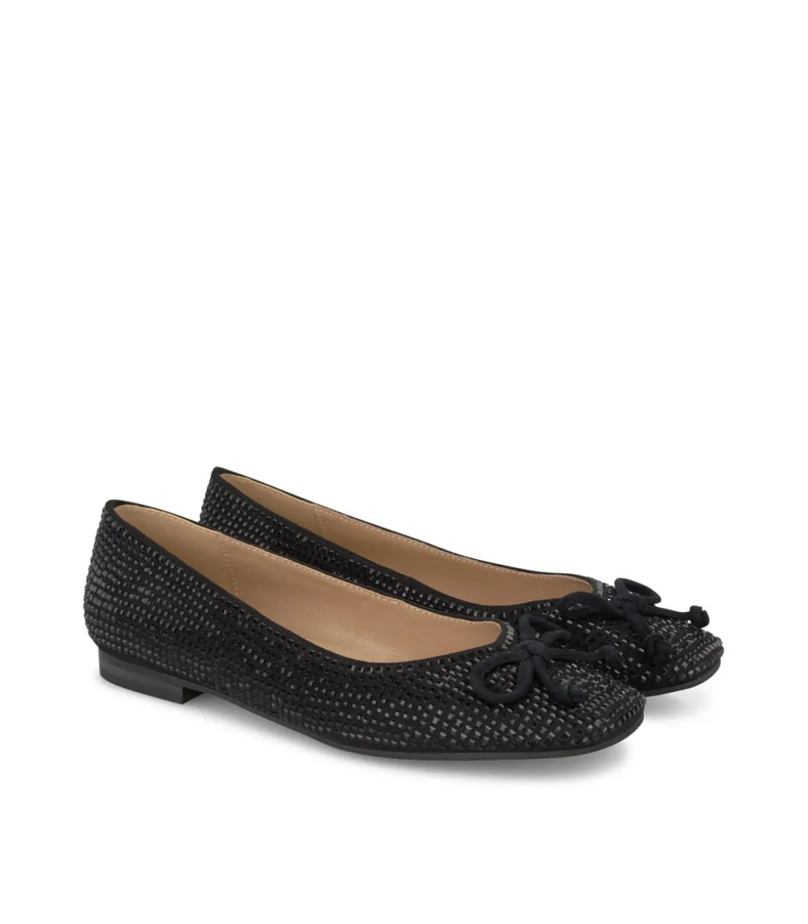Bailarina plana de mujer cubierta con pedrería y con lazo, puntera redondeada y sin cierre. La altura de tacón es de 1,5cm.