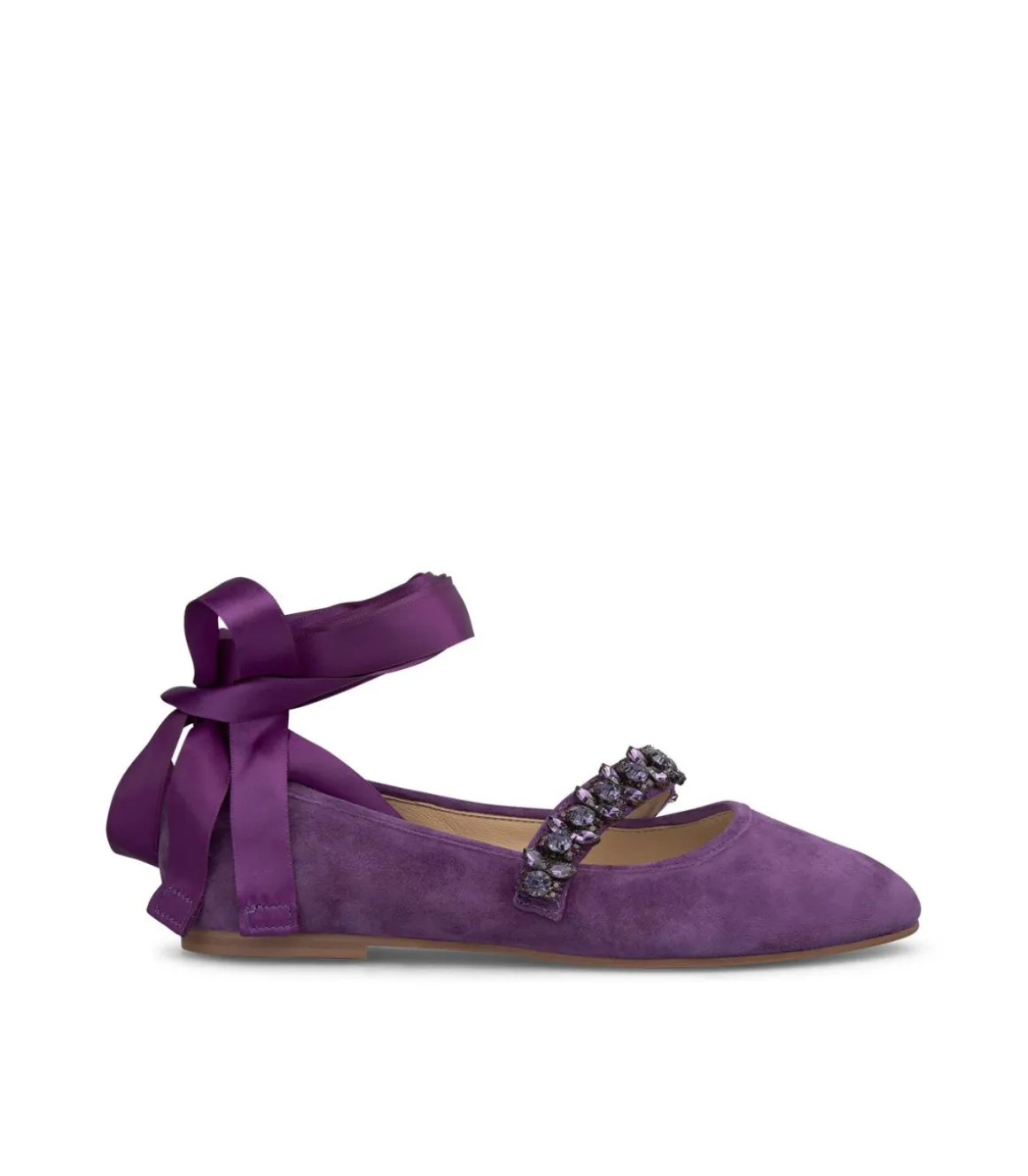 Bailarina plana de mujer con tira de pedrería, puntera redondeada y lazo atado al tobillo. Confeccionada en piel y la altura de tacón es de 1cm.