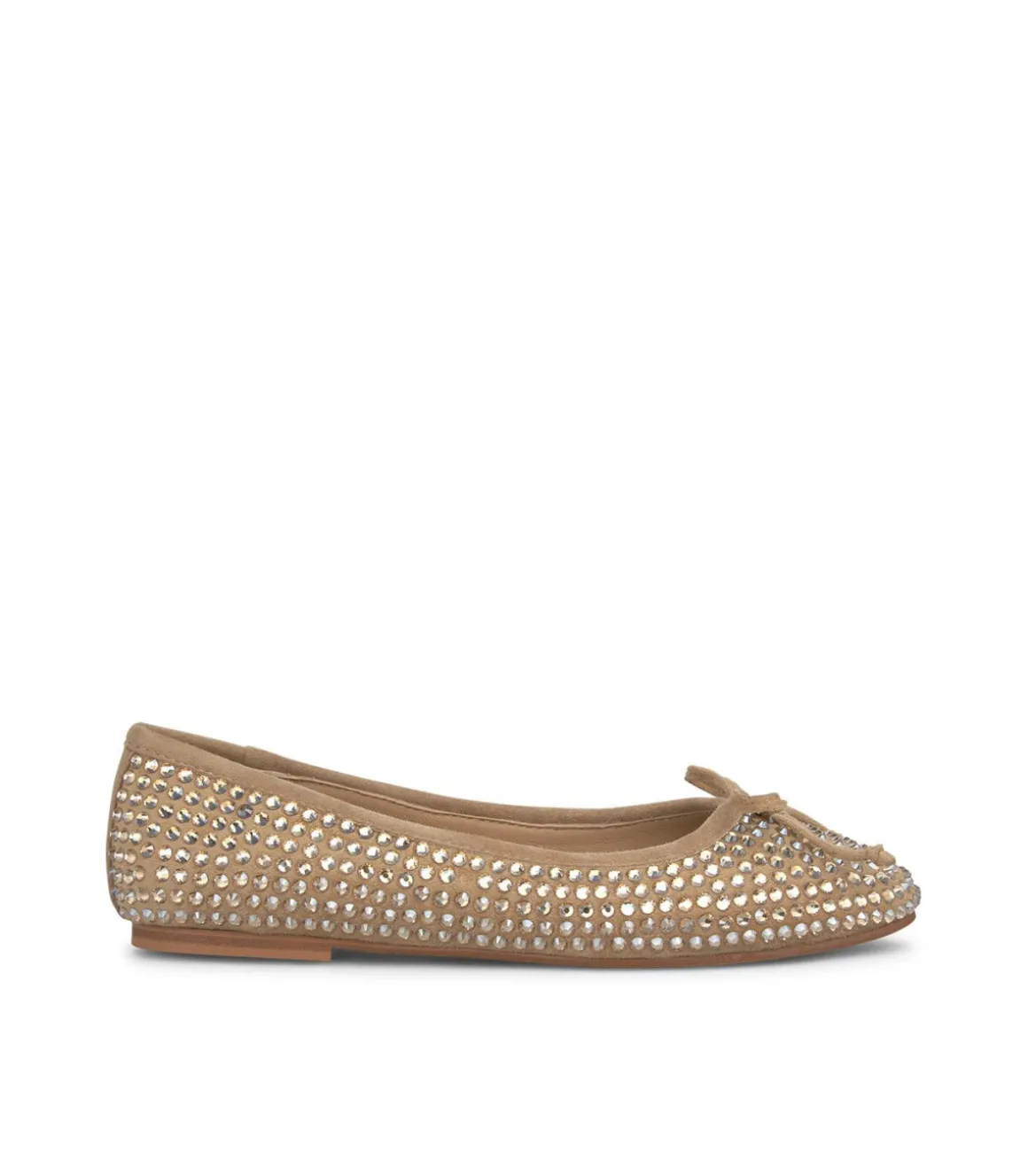 Bailarina plana de mujer cubierta con pedrería, puntera redondeada y lazo. La altura de tacón es de 1cm.