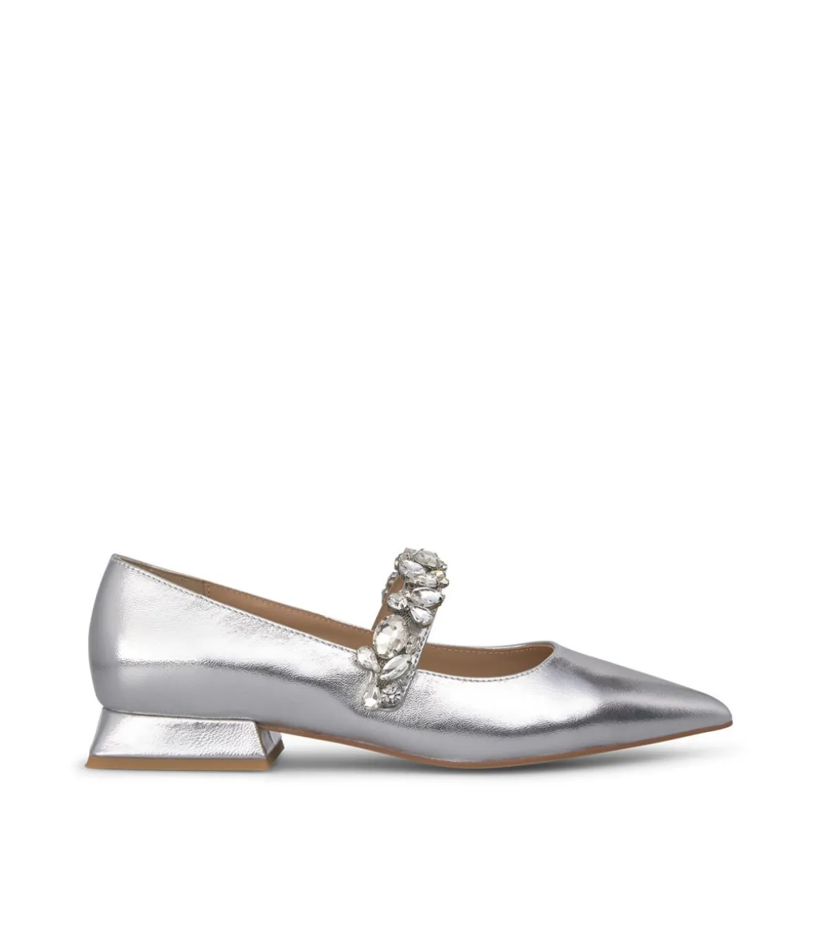 Bailarina plana de mujer con tira de pedrería y puntera afilada. Confeccionada en piel y la altura del tacón es de 2,2cm.