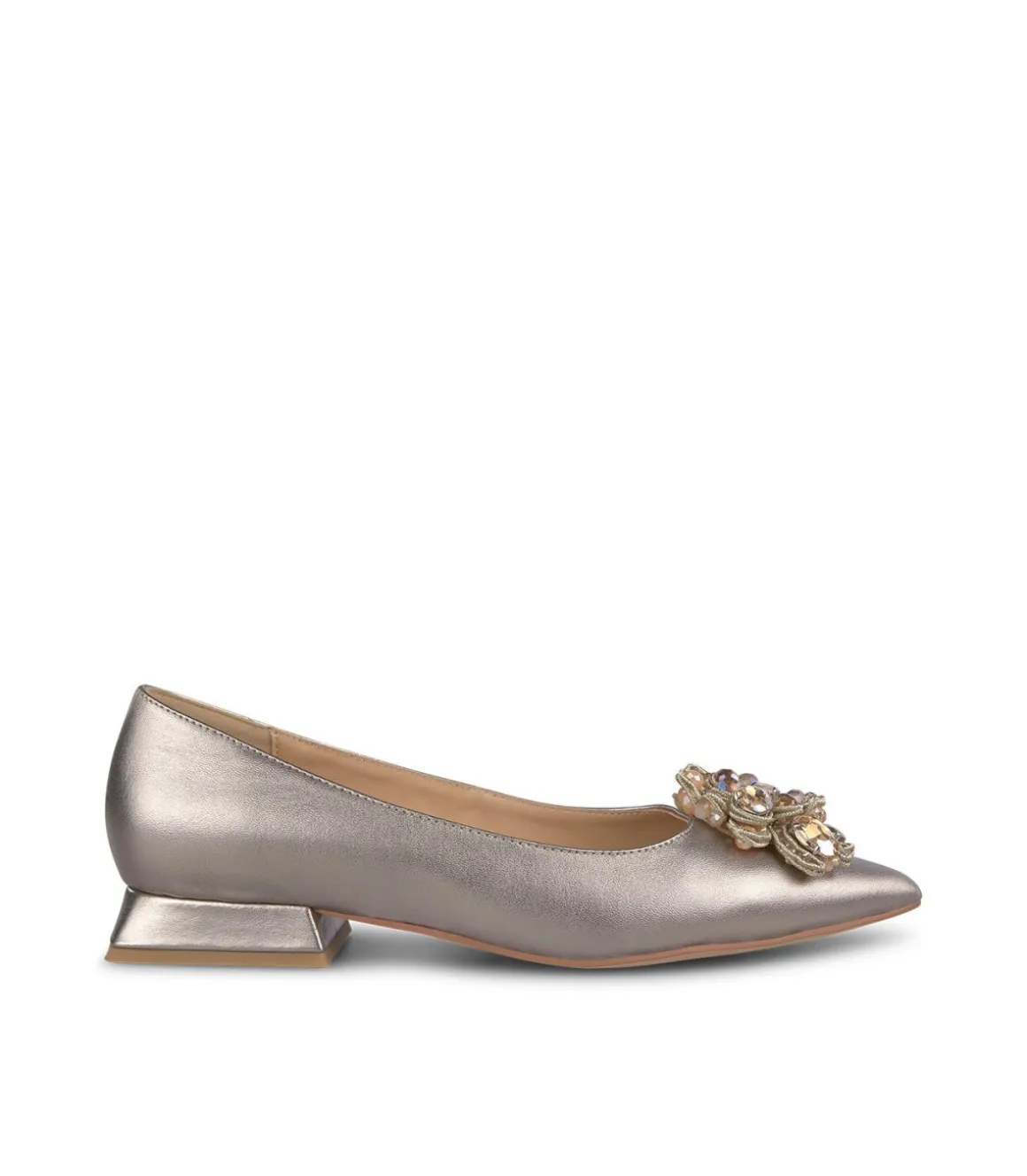 Bailarina de mujer realizada en piel con adorno de flor cubierta de pedrería. La altura del tacón es de 2,4cm.