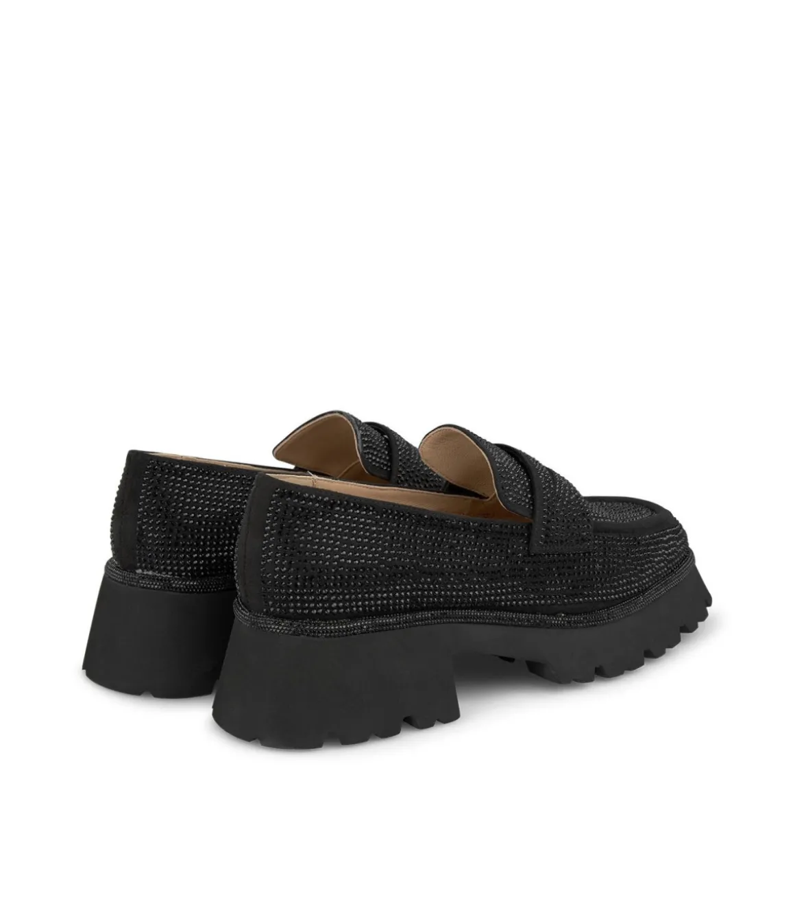 Mocasín de mujer con plataforma. Cubierto con pedrería y tira de pedrería en la suela. Con puntera cuadrada y sin cie…