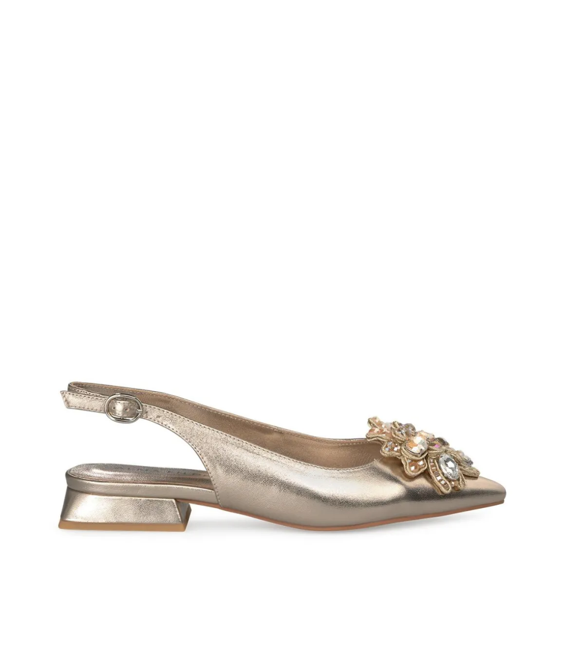 Zapato plano de mujer realizado en piel con adorno flor de pedrería. Sin cierre y puntera afilada. La altura del tacón es de 2cm.