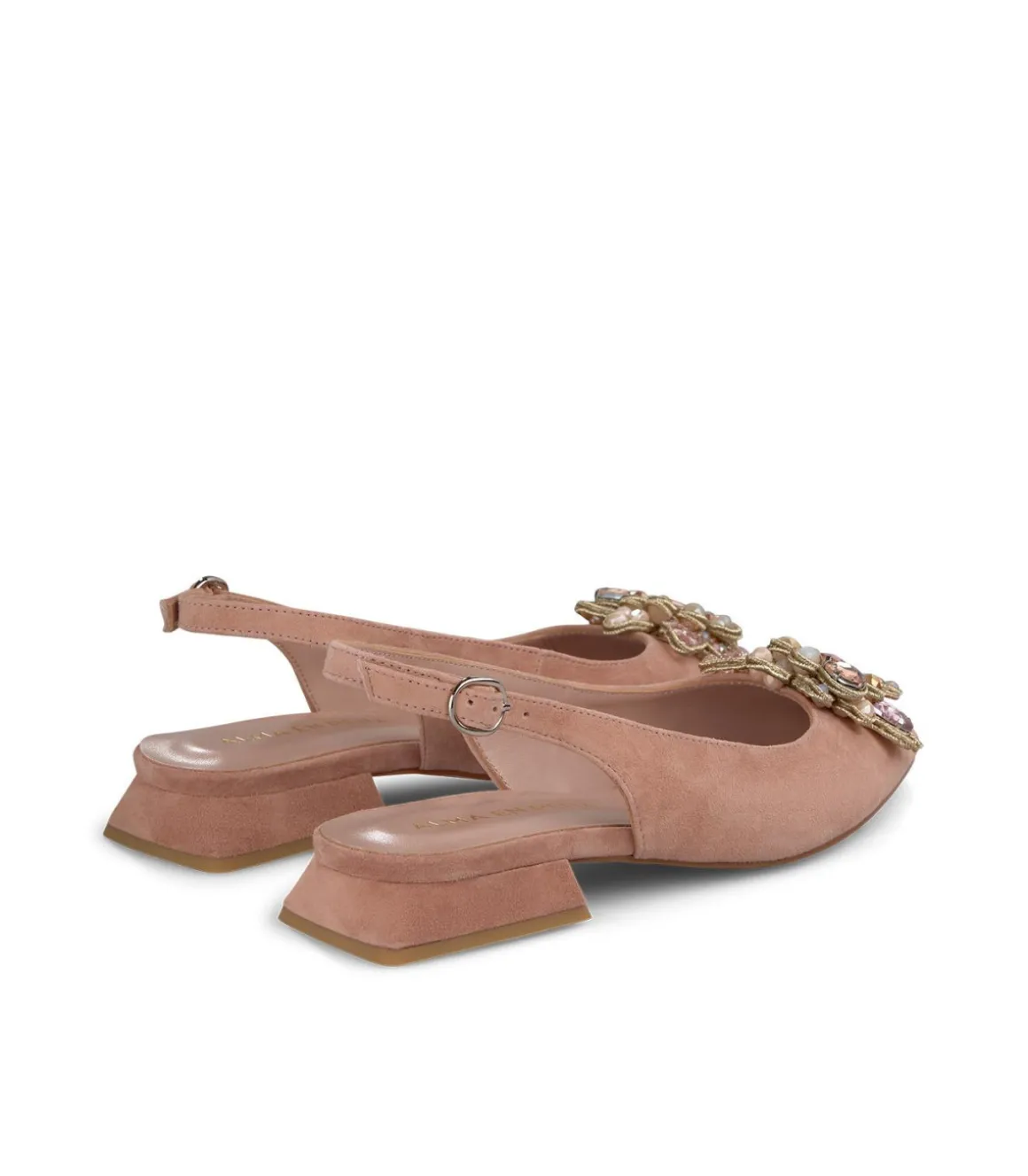 Zapato plano de mujer realizado en piel con adorno flor de pedrería. Sin cierre y puntera afilada. La altura del tacón es de 2cm.