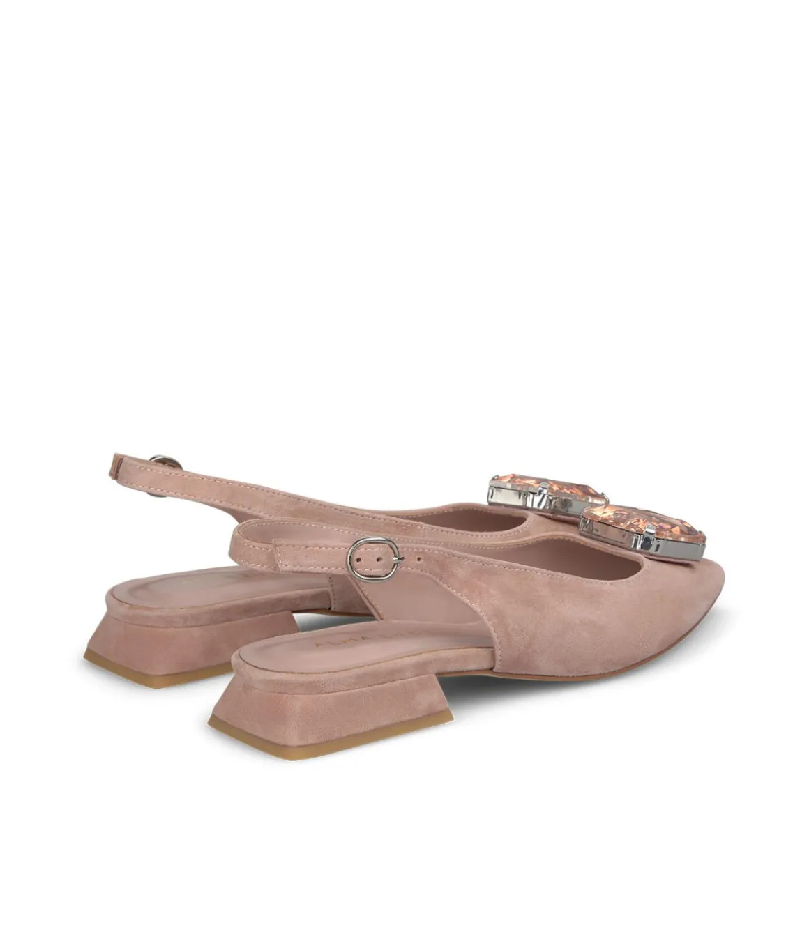 Zapato plano de mujer realizado en piel con adorno de piedra grande en la puntera. Sin cierre y puntera afilada. La altura del tacón es de 2cm.