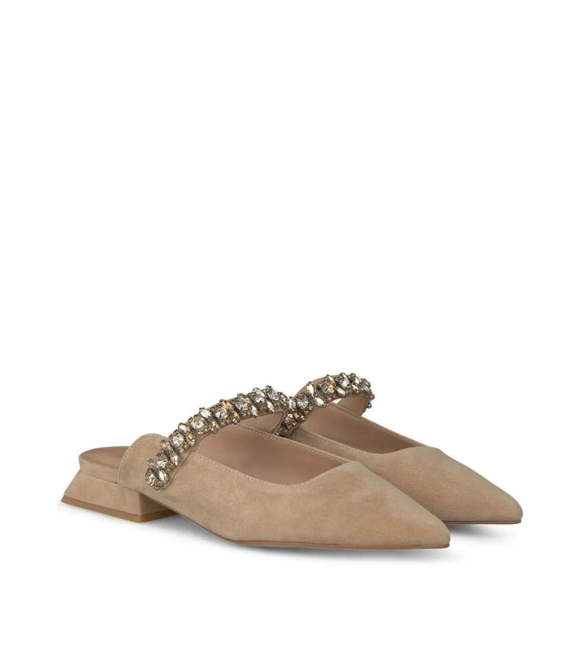 Zapato plano de mujer con puntera afilada realizado en piel con adorno de pedrería. Sin cierre.La altura del tacón es de 2cm.